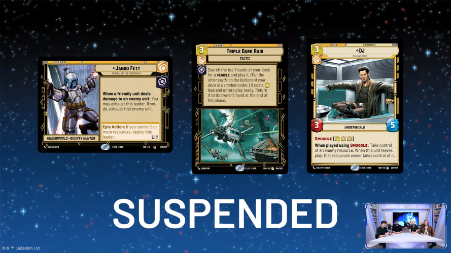 FFG announced that effective April 11th Jango Fett, Concealing the Conspiracy; Triple Dark Raid; and DJ, Blatant Thief will be suspended. These cards join the already-suspended Boba Fett, Collecting the Bounty. Why these cards were suspended is no mystery, and perhaps most people weren’t at all shocked by FFG’s announcement. Most players were probably elated at the news.